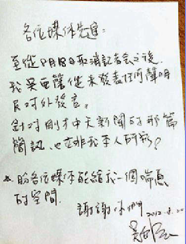 吴亚馨亲笔信(图片来源:台湾“联合报”) 据台湾媒体消息,昨有媒体报道吴亚馨传给友人的简讯,内容描述她和李宗瑞交往过程,并承认曾被拍裸照,但吴亚馨又透过经纪公司发亲笔信,否认有此短信。 据报道,三百多字短信指吴亚馨承认拍裸照,“有过正常男女关系后,他(李宗瑞)拿出手机、相机拍摄,第一次两人裸身看镜头,之后他喜欢拍摄过程,我开始抗议拒绝。”、“这次新闻事件出来一直不回应,是因为不知道照片里面有什么,看到照片才明白,很多是趁我喝很醉不省人事时拍的,即使我当时知道,也没力气跟意识抗拒。” 短信中还描述两人交往过程,“一开始不觉得他是个行为偏差的人,表现很乖,还以家庭父母失和博取同情。”、“交往到后面,知道他不是个好男生,外面甚至乱搞,所以要求分手。” 此外,短信还提到分手后李宗瑞要求吴亚馨去他家,甚至在MSN上威胁若不来就公布裸照,“他把裸照上传在MSN开头照片上,我吓死了,只好硬着头皮去。”报道指两人最后一次见面有性关系后,李宗瑞答应删掉照片,吴亚馨确认后离去。 吴亚馨亲笔信内容: 八月十八日取消记者会之后,我吴亚馨从未发表任何声明及对外发言。针对中天新闻那篇简讯,并非我本人所写。盼各位媒体给我一个喘息的空间,谢谢你们。 |