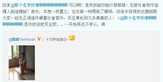 关颖 据台湾媒体报道,和淫魔李宗瑞合照过的女星名媛不计其数,关颖在第一时间也曾因一张生日会上的合照,被影射是不雅照女星之一,她的经纪人邱璃宽立刻跳出来澄清,还扬言要告,但仍有网友不相信,到关颖微博留言呛:“(淫照女星)是你(关颖)的话就死全家。”让关颖也忍不住反击。 关颖19日晚上连发3条微博,指名道姓回应该网友:“可以啊!是我的话你说什么都算!怎么社会有你这种人说这种话?首先,本想一笑置之,也在第一时间做了声明,但后来发现我也应该跟大家一起去正视这件严重社会案件,而且牵扯到太多无辜的人!” 关颖觉得许多人已经分不清楚是非对错,在微博说:“我很痛心的是怎么很多人已搞不清楚真正坏人是谁,坏人根本不是受害者,一些跟此事无相关的人包括我更是无辜!” 她也痛批胡乱捏造事实,而想延续事件的网友们很不可取,关颖留言:“更可悲的是用捏造的方式(合成照或不知哪里引用来的照片)要延续这件事的网友们,真的好可怕好可恶!再看到网友的评论更觉得深憾~好像恨不得就是我本人,会污蔑人或喜欢落井下石的人到底存什么心态啊?” 不少粉丝也留言力挺她,表示一点都不相信她和淫魔有关系,也劝她清者自清别太生气,关颖也留言感谢粉丝相挺:“给支持我关心我爱我的好男生好女生们:Have a colorful day everyday!!!!~ 晚安~”。 |