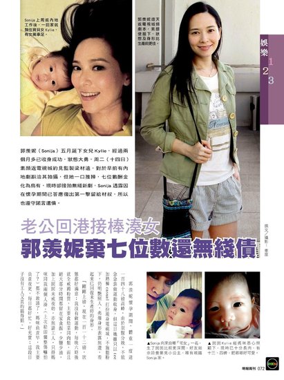 据香港媒体报道,郭羡妮(Sonija)五月诞下女儿Kylie,经过两个月多已收身成功,状态大勇,周二(十四日)素颜返电视城约见监制梁材远。
